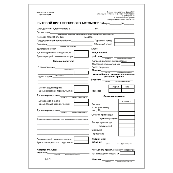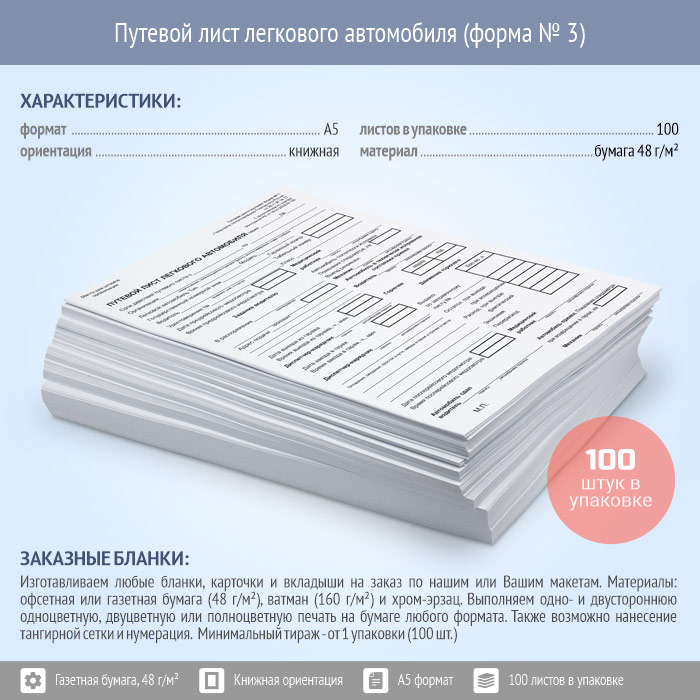 Путевой лист легкового автомобиля (форма № 3, упаковка из 100 штук) в Рошале купить
