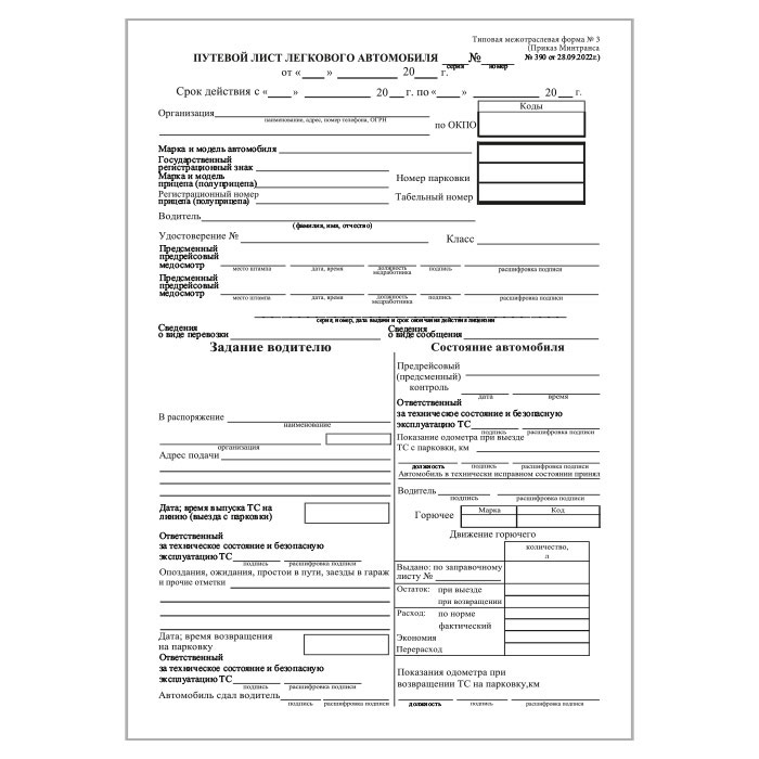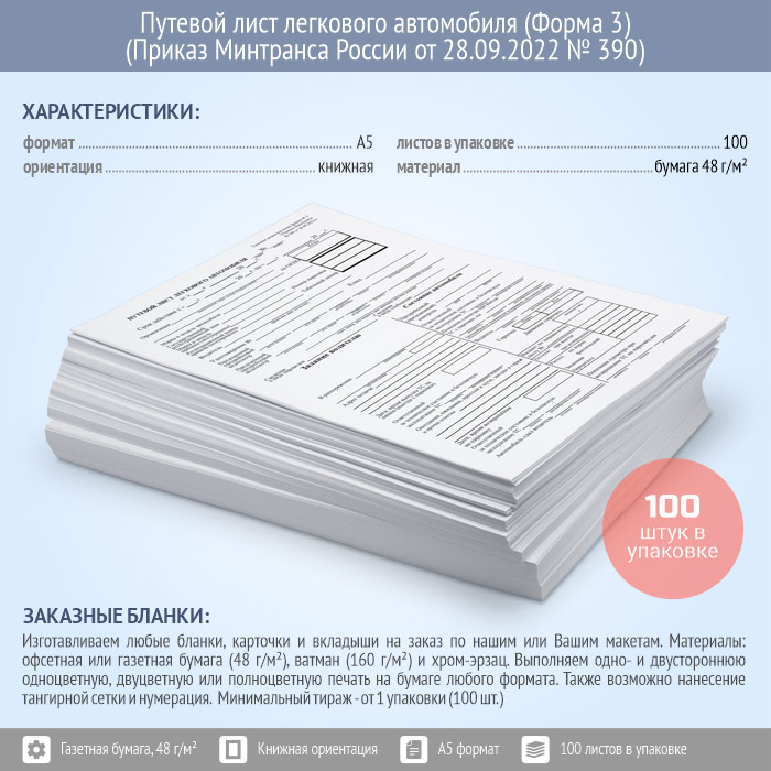 Путевой лист легкового автомобиля (Форма № 3) (Приказ Минтранса России от 28.09.2022 № 390) (упаковка из 100 штук) в Рошале купить
