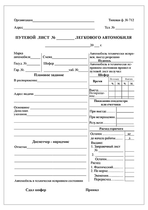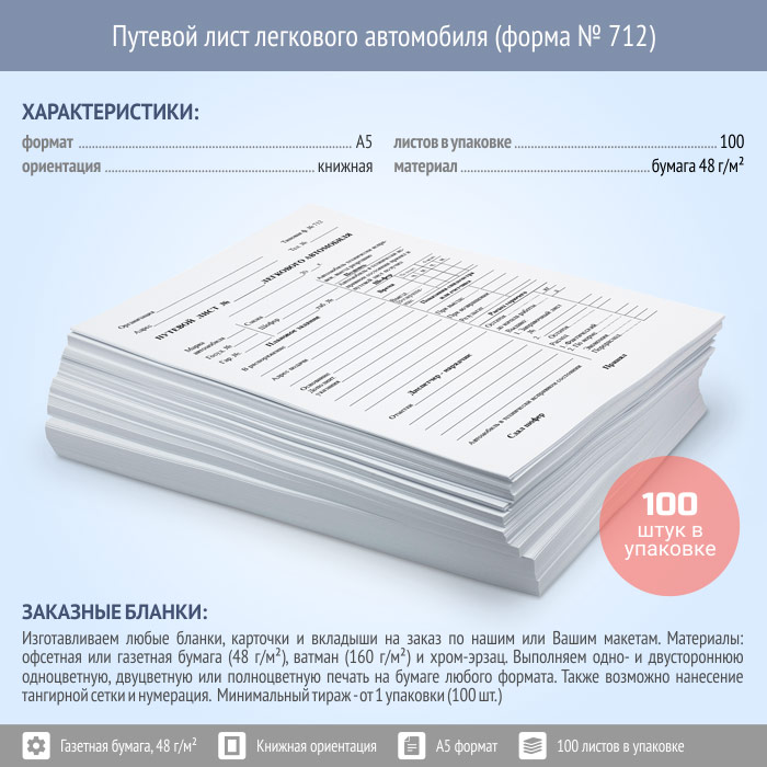 Путевой лист легкового автомобиля (форма № 712, упаковка из 100 штук) в Рошале купить