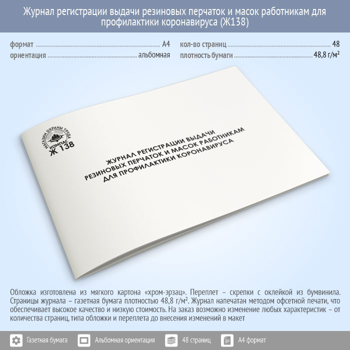 Журнал регистрации выдачи резиновых перчаток и масок работникам для профилактики коронавируса (48 стр., Ж138) в Рошале купить