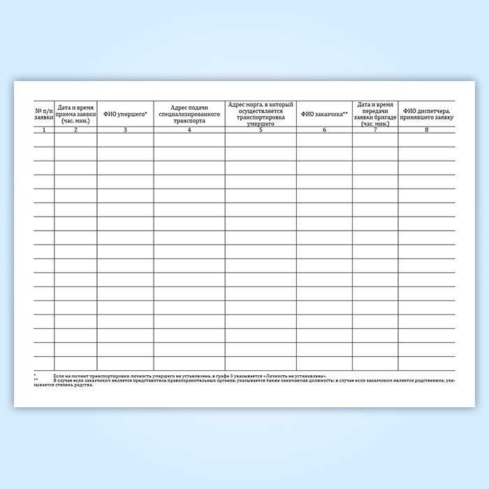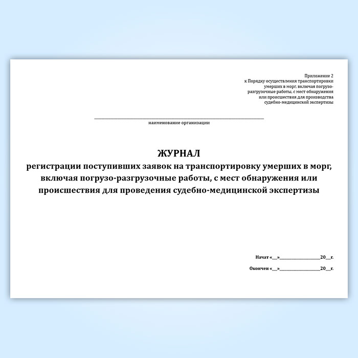 Журнал регистрации поступивших заявок на транспортировку умерших в морг, включая погрузо-разгрузочные работы, с мест обнаружения или происшествия для проведения судебно-медицинской экспертизы в Рошале купить