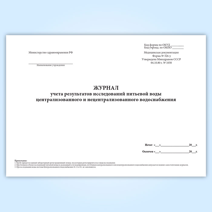 Журнал учета результатов исследований питьевой воды централизованного и нецентрализованного водоснабжения (форма 326-у) в Рошале купить