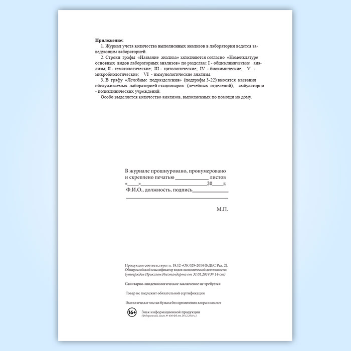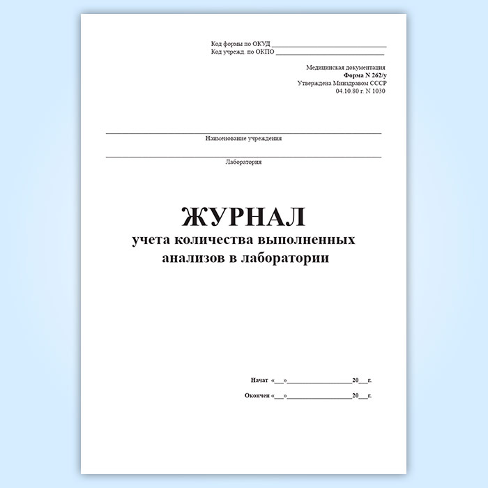 Журнал учета количества выполненных анализов в лаборатории (форма 262/у) в Рошале купить
