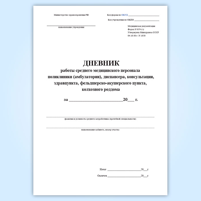 Дневник работы среднего медицинского персонала поликлиники (амбулатории), диспансера, консультации, здравпункта, фельдшерско-акушерского пункта, колхозного роддома (форма 039-1/у) в Рошале купить