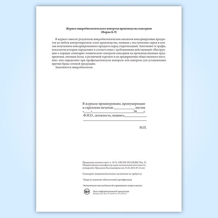 Журнал микробиологического контроля производства консервов (форма К-9) в Рошале купить