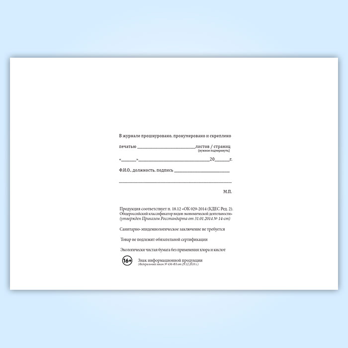 Вы получаете печатную продукцию прошнурованной и c местом для вашей печати в соответствии с действующими нормативными документами: