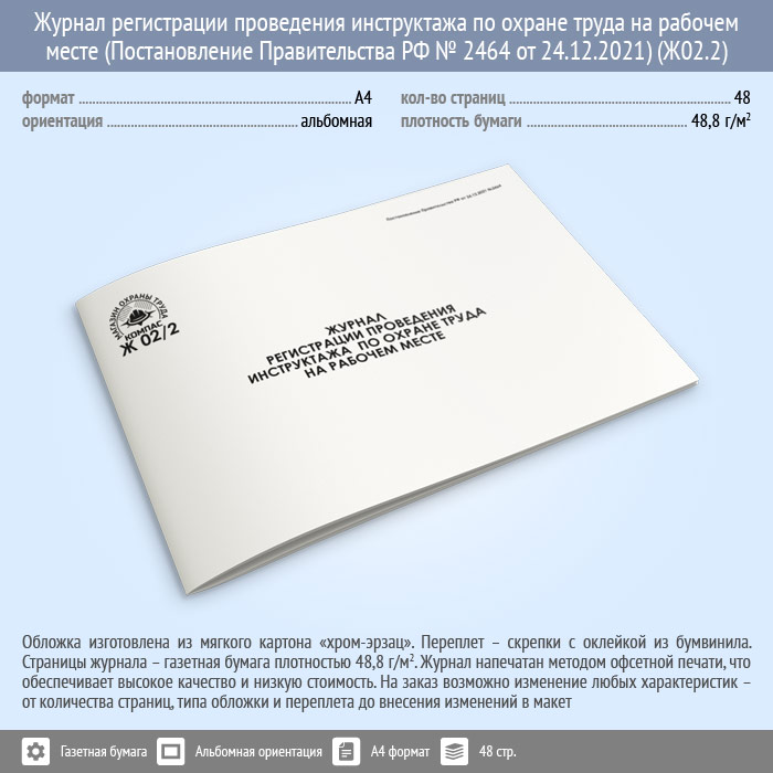 Журнал регистрации проведения инструктажа по охране труда на рабочем месте (Постановление Правительства РФ № 2464 от 24.12.2021) (48 стр., Ж02.2) в Рошале купить
