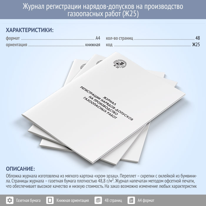 Журнал регистрации нарядов-допусков на производство газоопасных работ (48 стр., Ж25) в Рошале купить