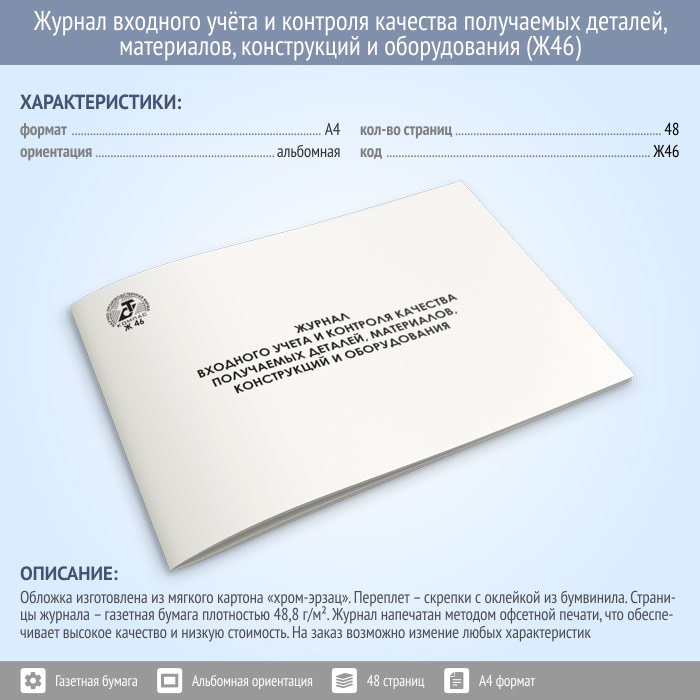 Журнал входного учета и контроля качества получаемых деталей, материалов, конструкций и оборудования (48 стр., Ж46) в Рошале купить