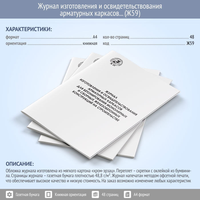 Журнал изготовления и освидетельствования арматурных каркасов для бетонирования монолитных и сборных железобетонных конструкций на строительстве (Ф-48) (48 стр., Ж59) в Рошале купить