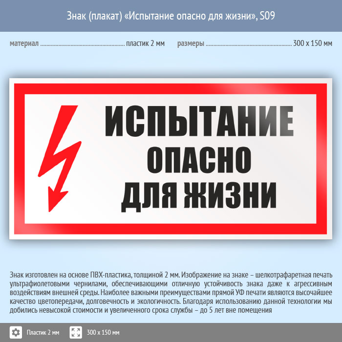 Знак (плакат) «Испытание опасно для жизни», S09 (пластик, 300х150 мм) в Рошале купить